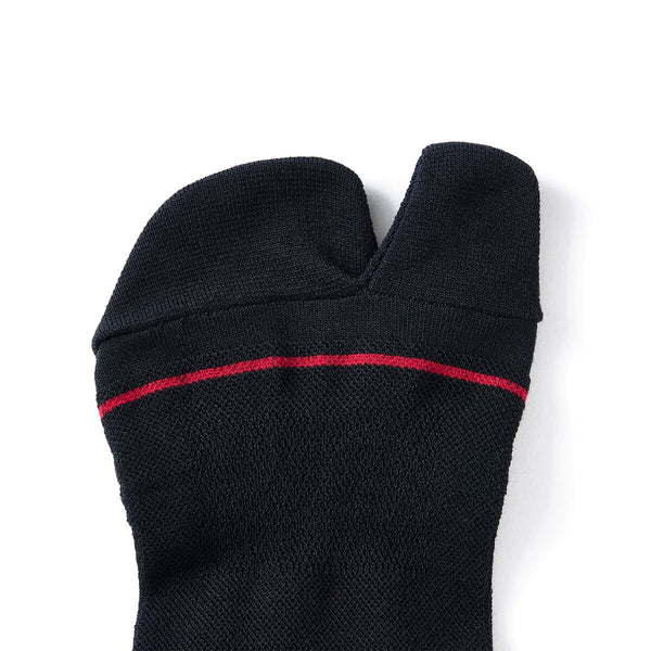 Running socks engineered to enhance performance when paired with        thick-soled shoes.